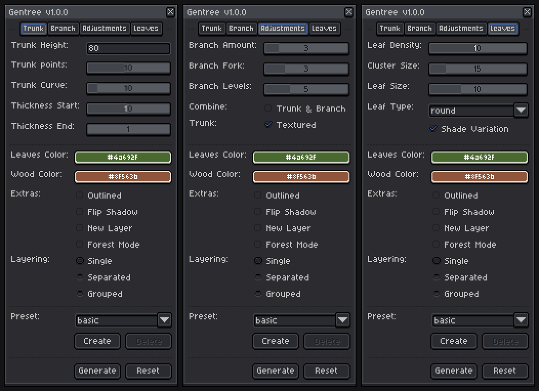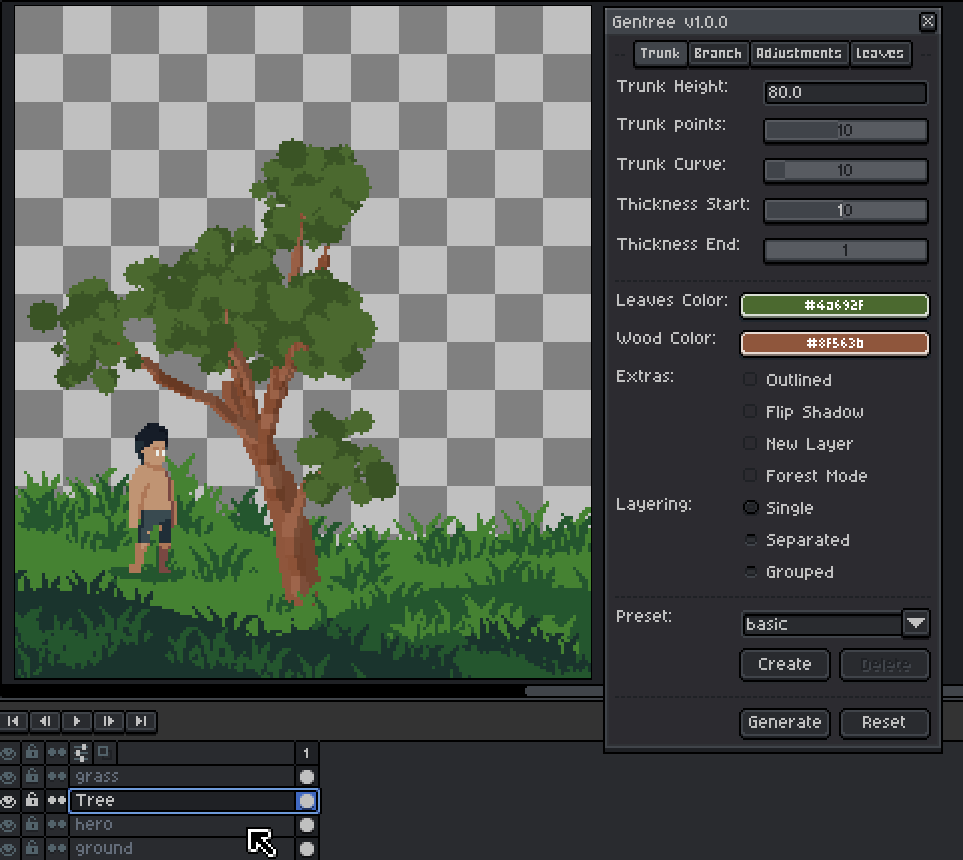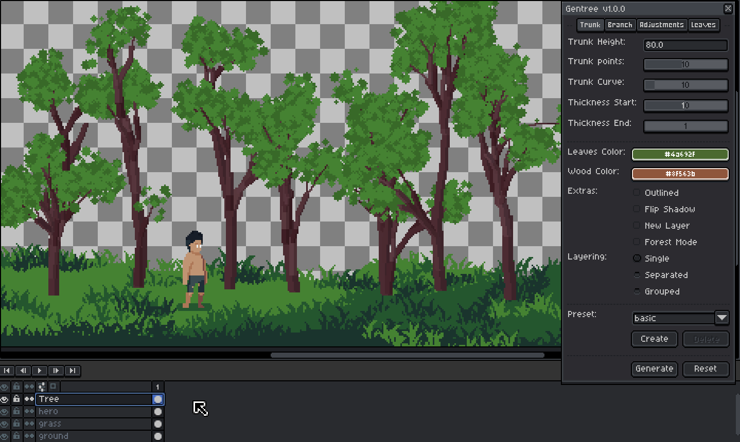 Gentree is an Aseprite extension that procedurally generates pixel art trees and foliage using customizable parameters and presets.
