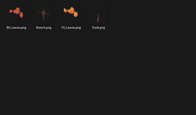 - Separated PNG Images: For each tree and its parts(background leaves, trunk, branch, foreground leaves), neatly organized into folders.