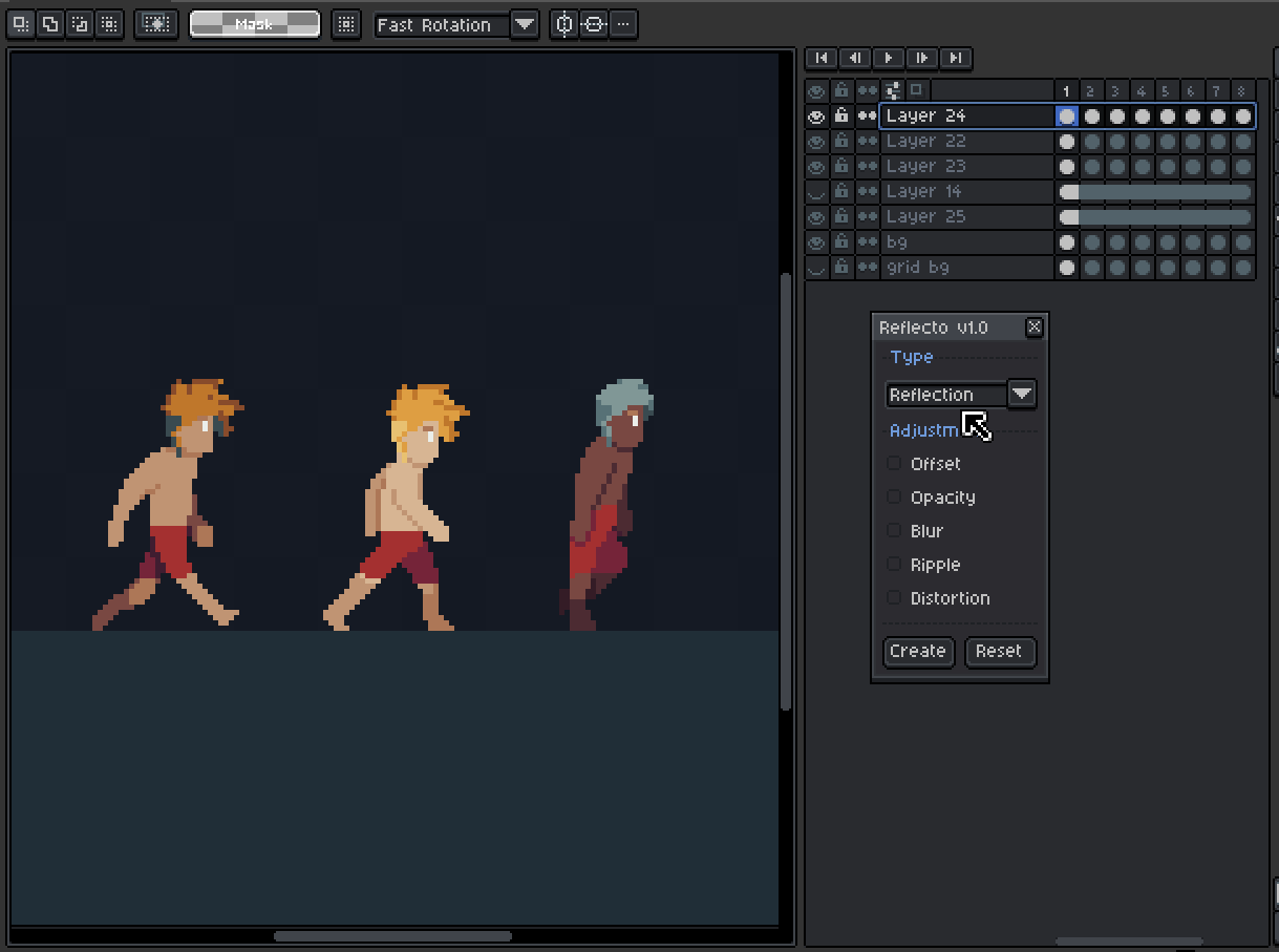 Reflecto is a lightweight and handy Aseprite extension that automatically creates vertical reflections of your sprite artwork in just a click. Whether you're working on mirror effects, water scenes, or stylized UIs, Reflecto saves you time by handling the flip, blur, and alignment for you.